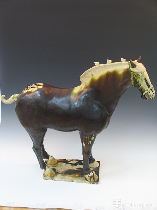 海南省博物馆收藏的生肖俑有唐代三彩马等。这件唐代三彩马,马首微倾,偏向一侧,戴辔头,两耳一前一后竖立,双眼炯炯有神,目视前方,四腿直立于长方形底板之上,通体施棕黑釉,马的脸部、鬃部、尾部均为白色,辔头、四蹄等又以黄、绿釉装饰,造型简洁利落、英姿勃发。唐三彩一般指以黄、绿、白为基本釉色的陶器,几种釉色互相渗化,又产生许多新色,呈现出的色彩并不仅限于三种,绚烂多彩、富丽堂皇。唐三彩艺术闻名中外,制作最盛的年代是开元、天宝年间,折射出博大、雄浑、奋进、深远、超逸的盛唐时代精神。