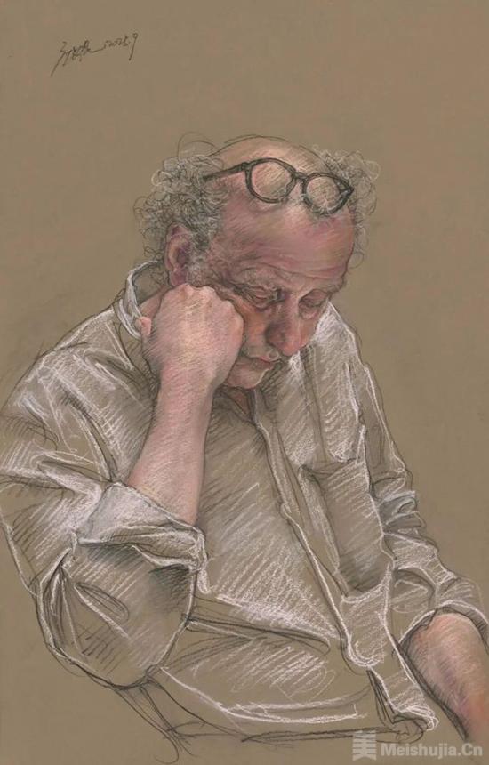 为了快速捕捉思路,文艺复兴时期的画家大量使用染过色的纸张画素描。偏冷或者偏暖的灰色纸,为素描提供了中间调,画家可以仅画出暗部和亮部,留下中间调不用画,因此效果出得很快。于是画家可以将注意力集中于模特的第一印象、大的形体关系等对表现力至关重要的地方。庞茂琨参加本次展览的许多色粉作品都画在色纸上,就是文艺复兴传统的体现。
